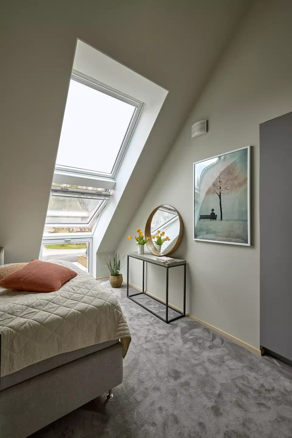 Správne vetranie má veľký význam pri udržiavaní dobrej kvality vzduchu v interiéri. Čerstvý vzduch ponúka širokú škálu výhod: cítime sa šťastnejší, posilňuje náš imunitný systém a pomáha mozgu lepšie fungovať. Vďaka strešným oknám v spálni možno zlepšiť prúdenie čerstvého vzduchu v domácnosti otvorením okien na opačných stranách domu. Čerstvý vzduch predstavuje jednoduchý spôsob, ako zabezpečiť zdravé vnútorné prostredie.