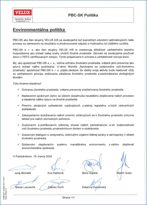 Partizánske Building Components-SK s.r.o je spoločnosťou so zodpovedným prístupom k životnému prostrediu, so zavedeným a certifikovaným systémom environmentálneho manažérstva podľa medzinárodnej normy ISO 14001, ktorý pomáha efektívne riadiť a tiež neustále zlepšovať ochranu životného prostredia. Dôležitou súčasťou systému je pravidelné sledovanie a vyhodnocovanie spotreby energií, médií a materiálov, ako aj množstva produkovaných odpadov, odpadových vôd a emisií a prijímanie environmentálnych opatrení na znižovanie vplyvu na životné prostredie.